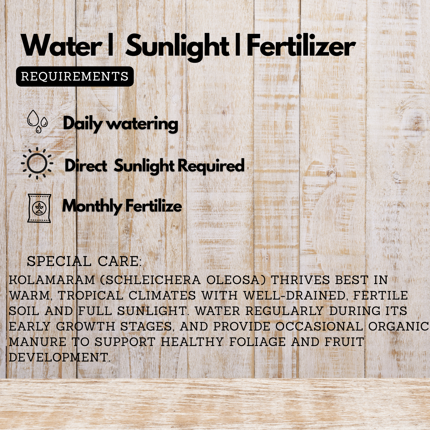 Kolamaram (Schleichera oleosa) thrives best in warm, tropical climates with well-drained, fertile soil and full sunlight. Water regularly during its early growth stages, and provide occasional organic manure to support healthy foliage and fruit development.